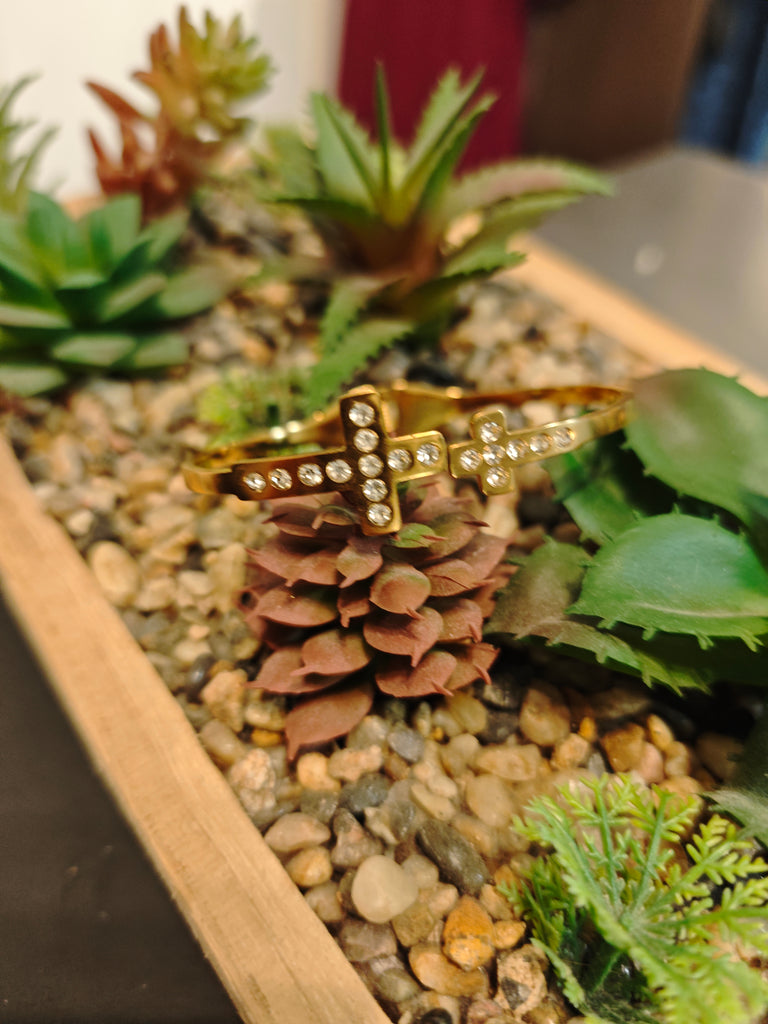 A timeless gold-toned bracelet featuring twin crystal-embellished crosses for a bold yet elegant look. This piece adds a touch of sparkle and meaning to any outfit — designed to layer beautifully or stand alone as a statement of style and strength. Stretch-fit for easy, comfortable wear.