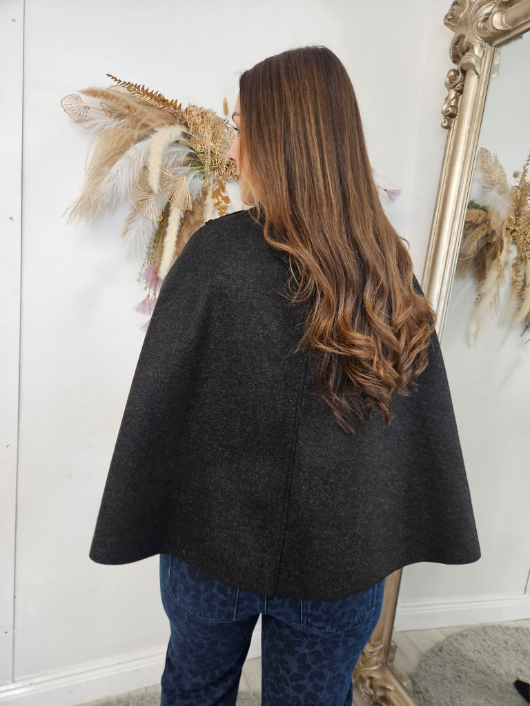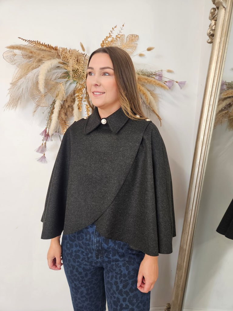 The Mia Navy Cape is a stylish and versatile addition to any wardrobe. With button details on each shoulder and a short, statement design, this cape offers both fashion and functionality. Made with high-quality materials, it provides comfort and style for any occasion.