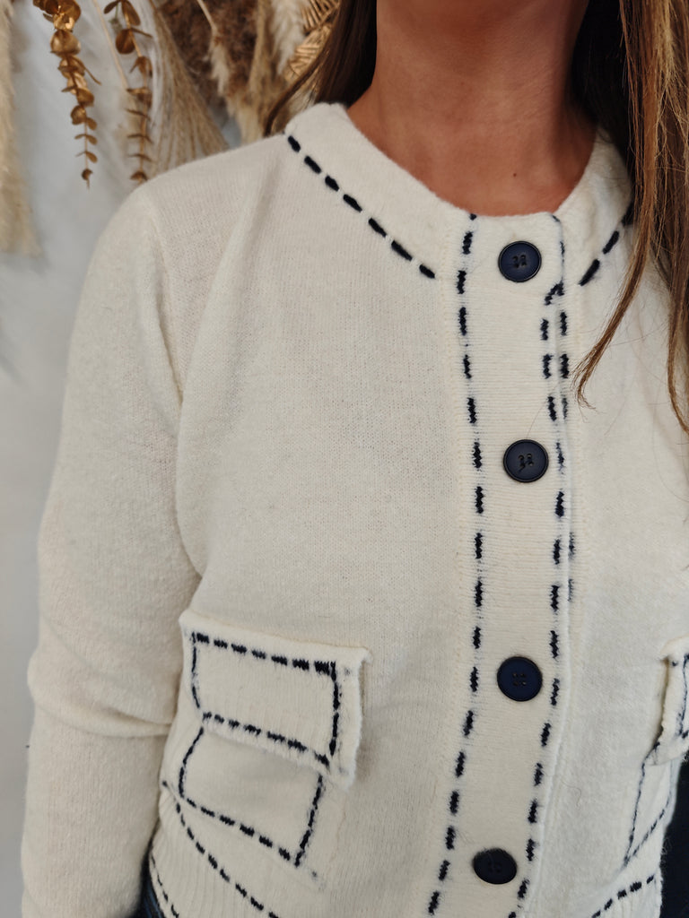 Infuse your wardrobe with effortless elegance with the Megan Cream Cardi. Made from the softest material, this button-down cardigan boasts a dual color stitch detail on the sleeves, pockets, and neckline, adding a touch of subtle sophistication to any outfit. Stay stylishly cozy in this versatile piece.