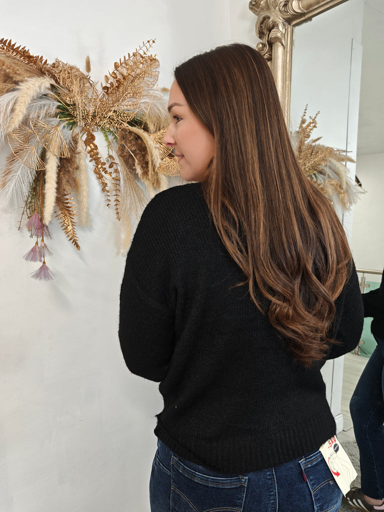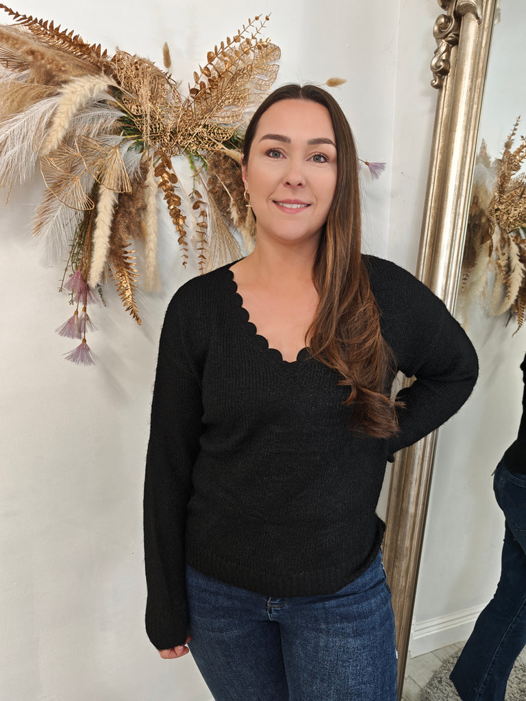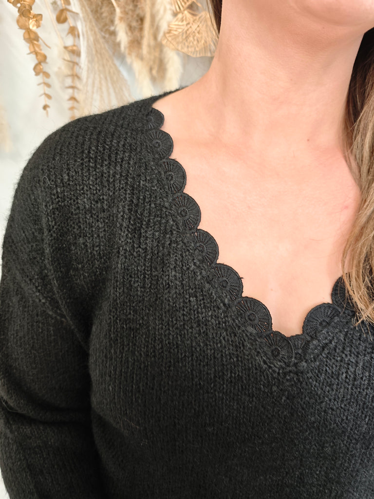 Indulge in luxury with our Darla Grey Sweater. The beautifully knit fabric is accentuated by a delicate lace neckline, creating a unique and stylish look. The v neck design adds a touch of sophistication, while the stretch knit fabric ensures maximum comfort. Stay cozy and chic in this must-have sweater!