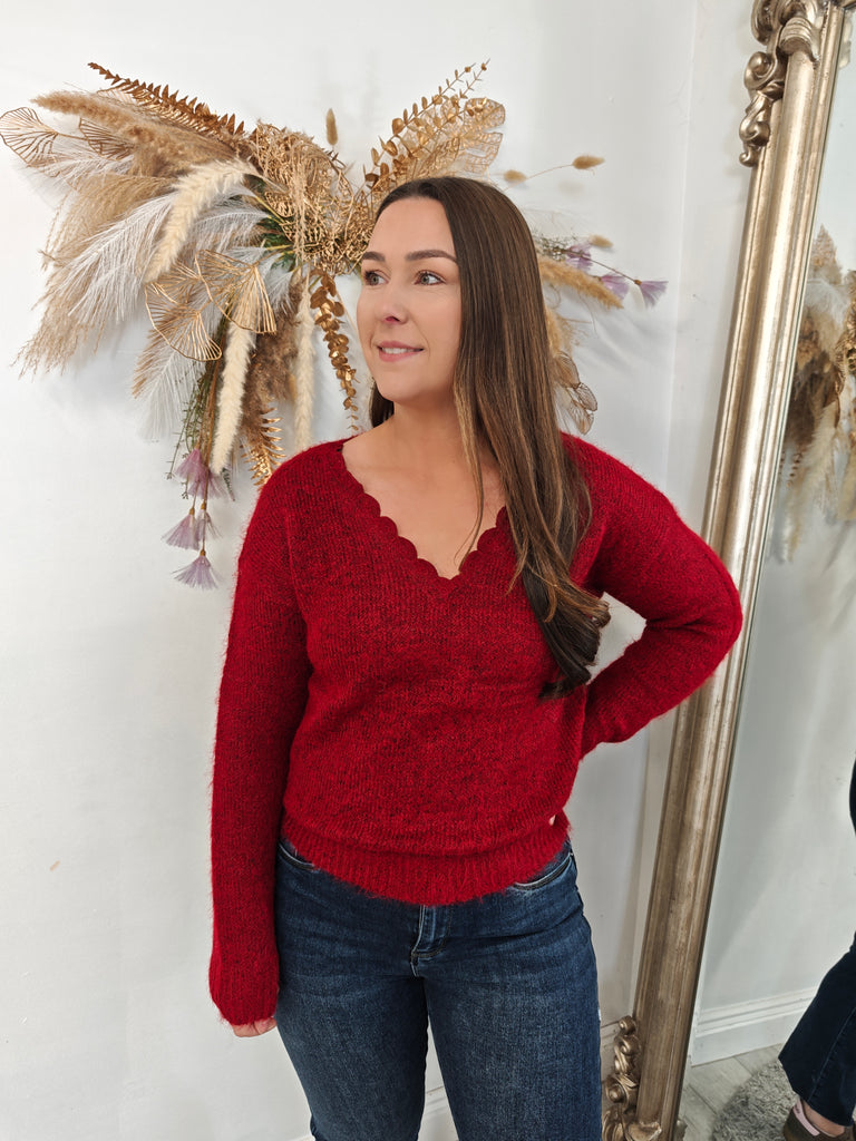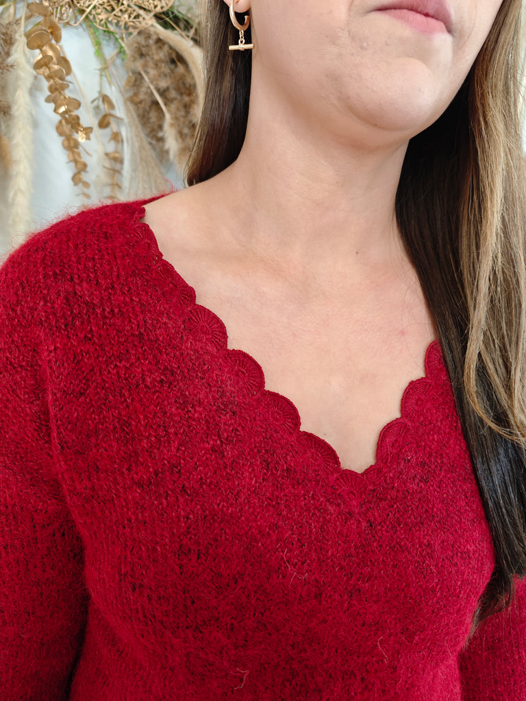 Indulge in luxury with our Darla Wine Sweater. The beautifully knit fabric is accentuated by a delicate lace neckline, creating a unique and stylish look. The v neck design adds a touch of sophistication, while the stretch knit fabric ensures maximum comfort. Stay cozy and chic in this must-have sweater!