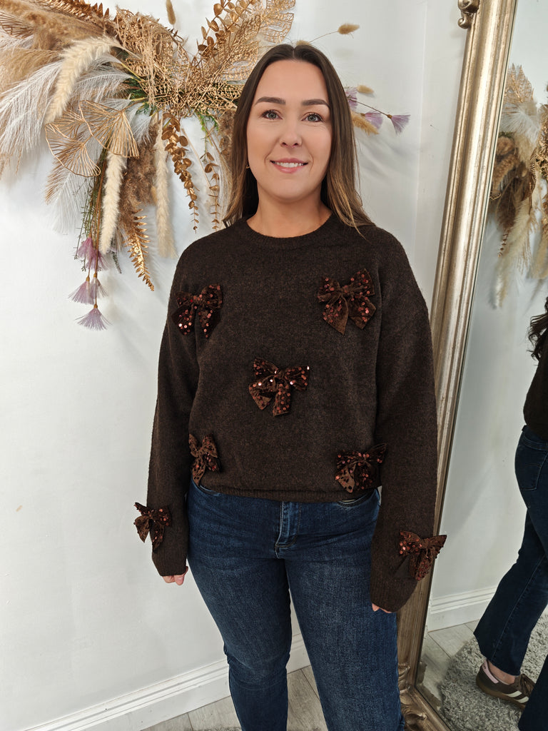 Looking for a little extra sparkle in your wardrobe? Look no further than our Sequin Bow Detail Knit Sweater! Brown Knit with Brown bow detail. With stunning 3D bows on the front, this super soft and comfy sweater will keep you stylish and cozy all day long. Say goodbye to boring sweaters and hello to a little touch of glam!