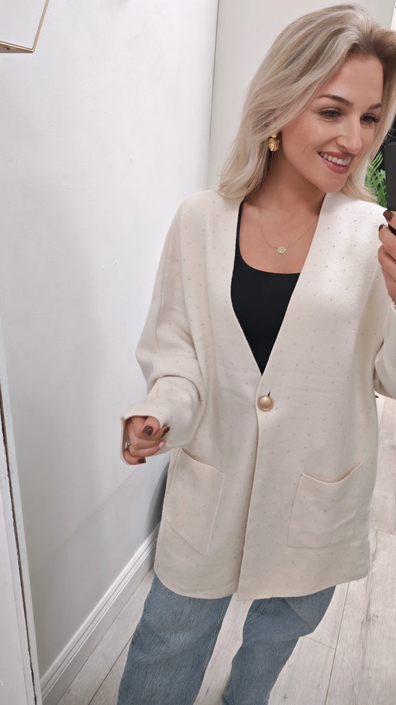 Upgrade your wardrobe with our Ayla Cream Glitz Cardi! This stunning relaxed fit cardi features a gold button fastening and runestone Glitz on the front, adding a touch of glamour to any outfit. The plain back keeps it simple and versatile. Don't miss out on this must-have piece!