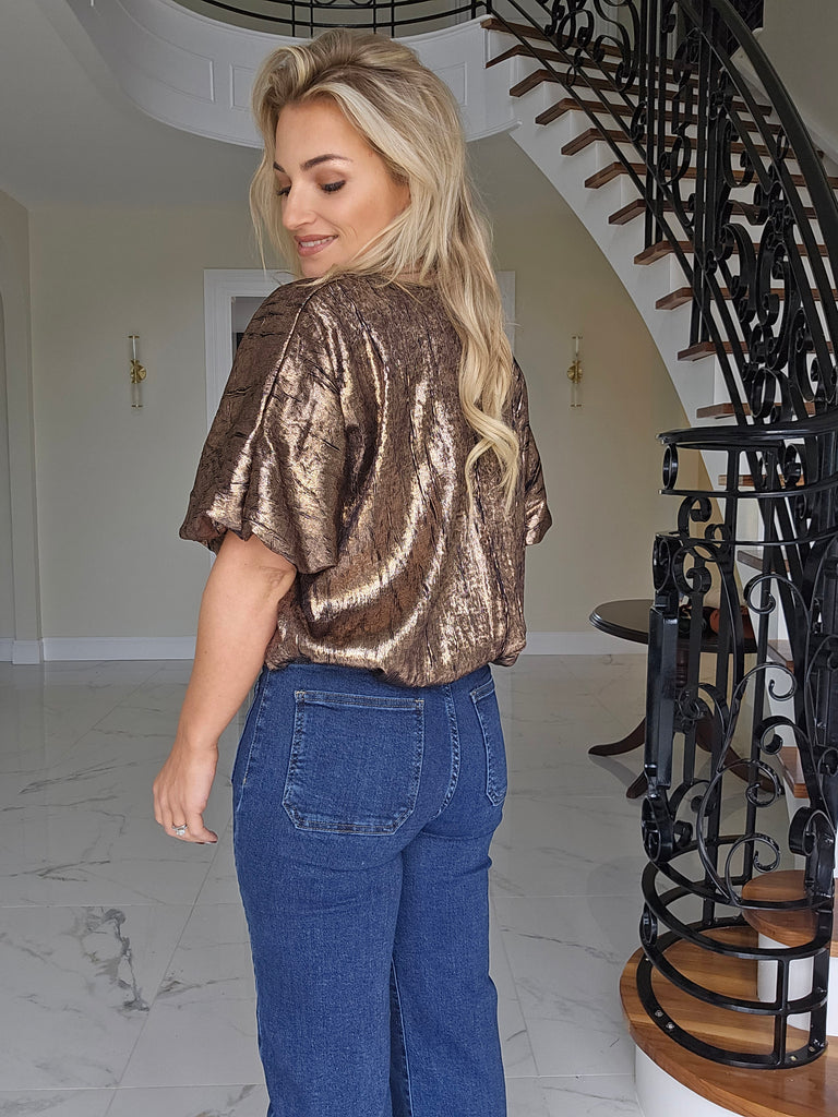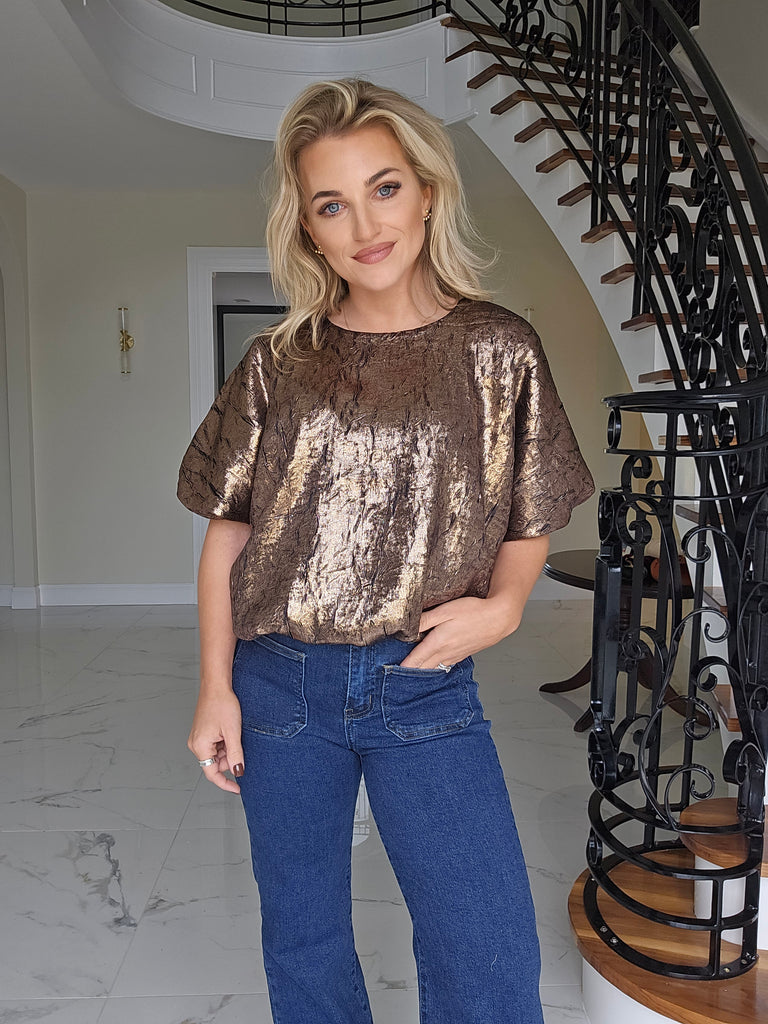 Introducing our stunning Bronze Foil Top, a must-have addition to your festive wardrobe! Featuring a shimmering copper metallic blouson top with elasticated sleeves and a comfortable elasticated waistband. Elevate your holiday look with this eye-catching piece.