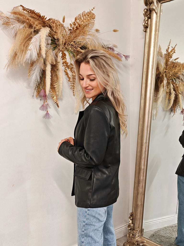 Add a sophisticated edge to your wardrobe with Jenna PU Jacket. The leatherette style blazer jacket features a one button closure and is fully lined for maximum comfort. Made of 100% polyester, this jacket offers an elevated and polished look for any occasion.
