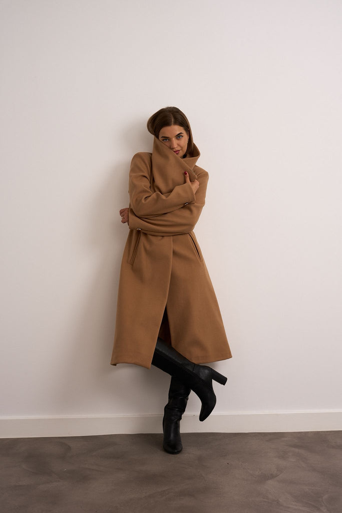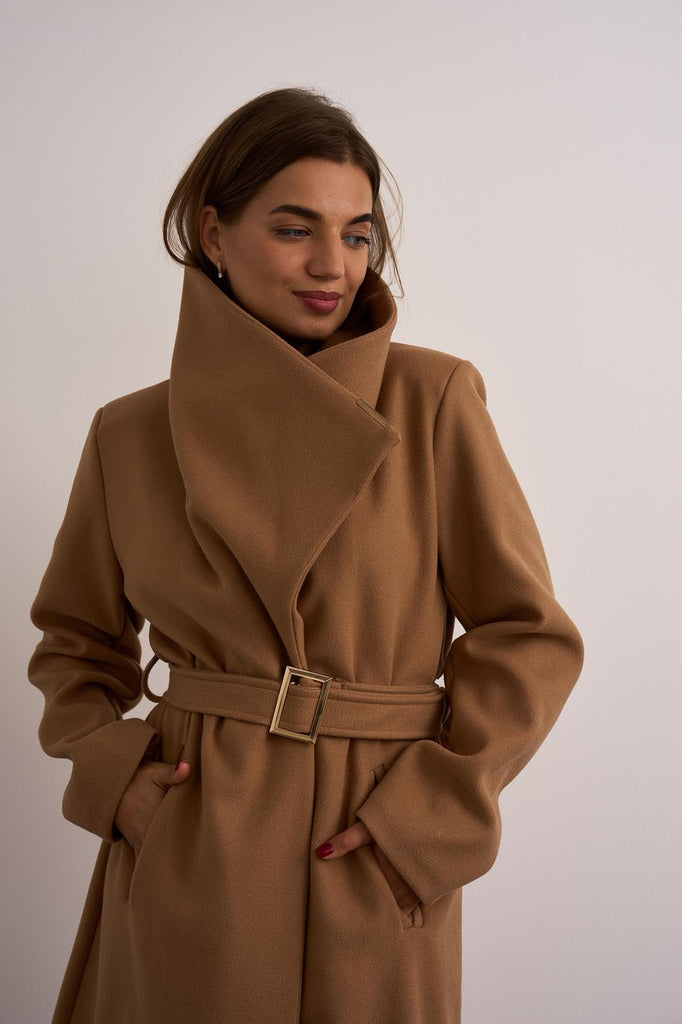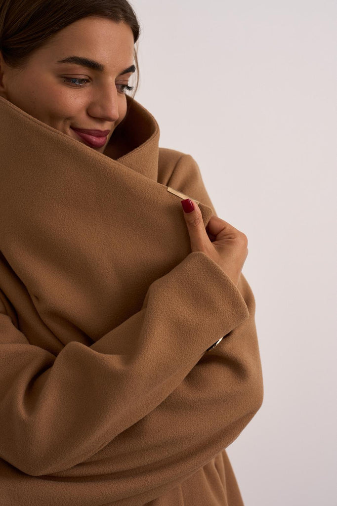 Wrap yourself in luxury with the Kyra wrap coat. Featuring elegant gold double button and clasp details, a midi length for added sophistication, and a material belt to cinch your waist. Stand out from the crowd in this stylish and timeless coat.