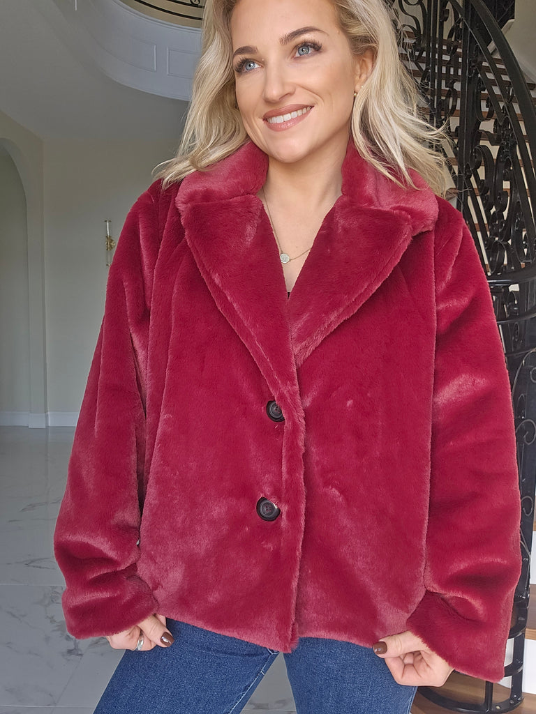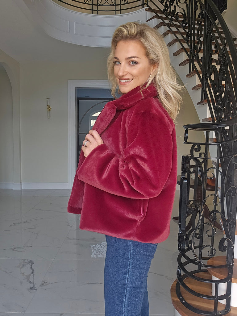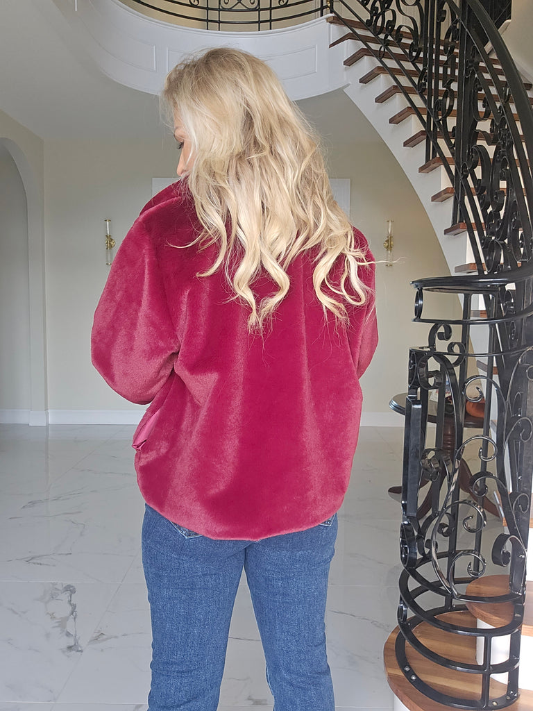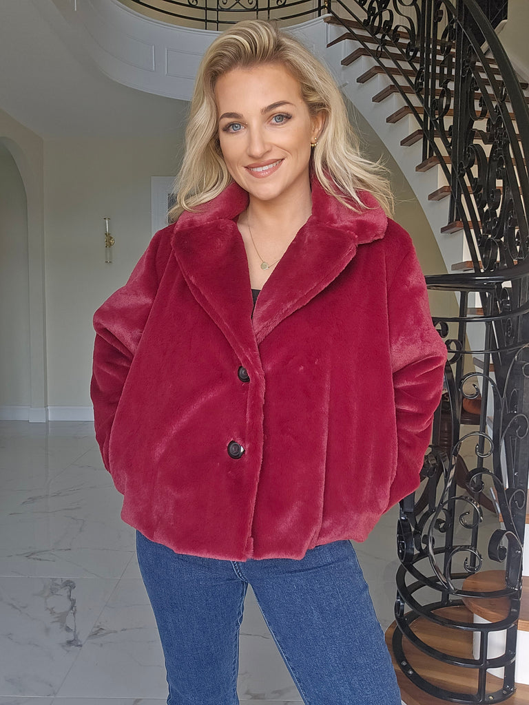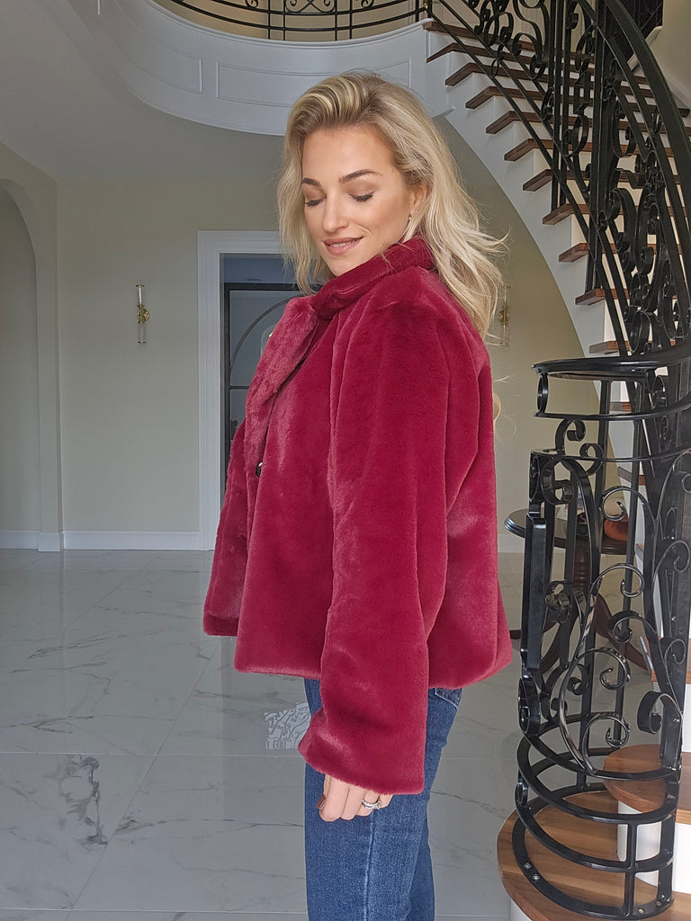 Stay cozy and stylish with the Izzy wine Faux Fur Jacket! This jacket features soft faux fur, oversized collars, 2 buttons, and convenient pockets, all in a relaxed fit for ultimate comfort. Embrace the colder weather in this must-have statement piece.