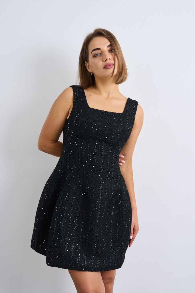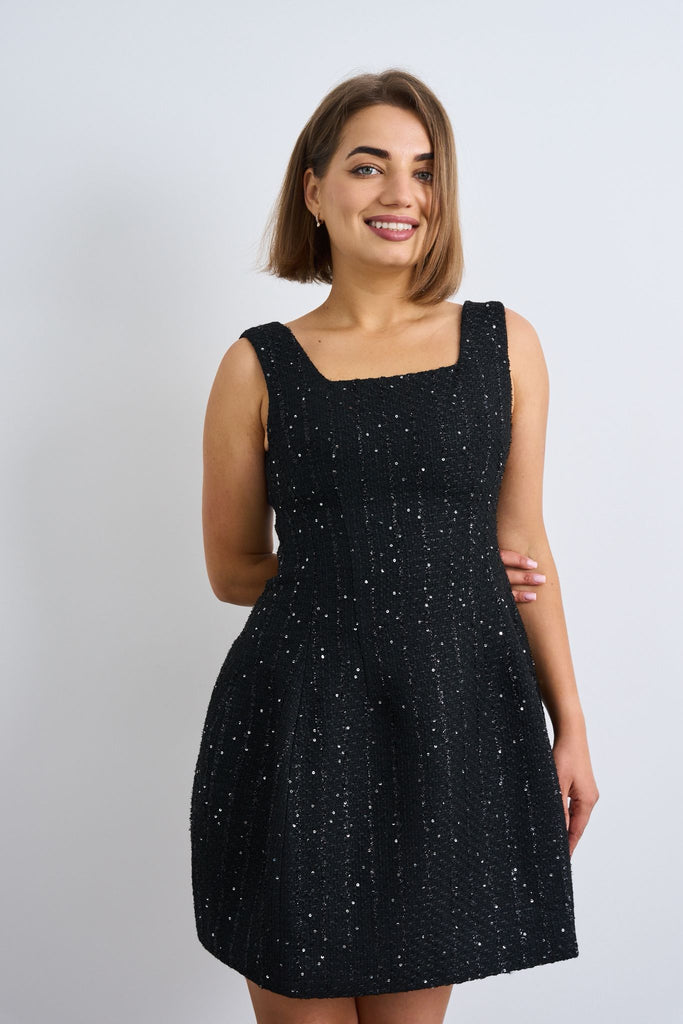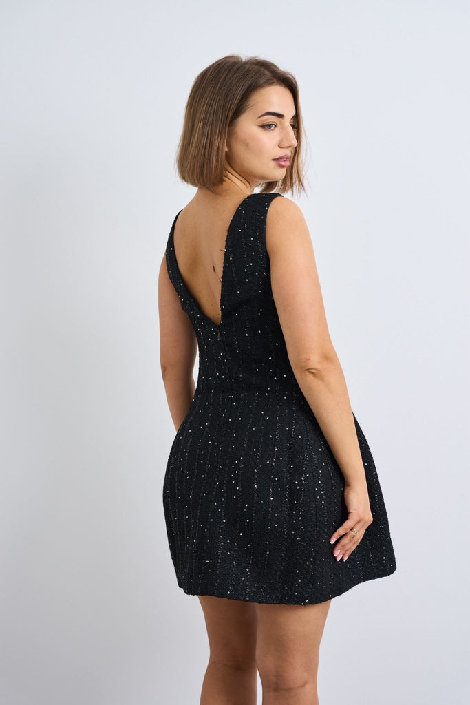 Unleash your inner fashionista in the Millie Glitz Mini Dress. This stunning mini dress features a tweed-like glitz fabric that catches the eye and a square neck that flatters any figure. The V back detail adds a touch of elegance. Perfect for a night out or special event. Lined.