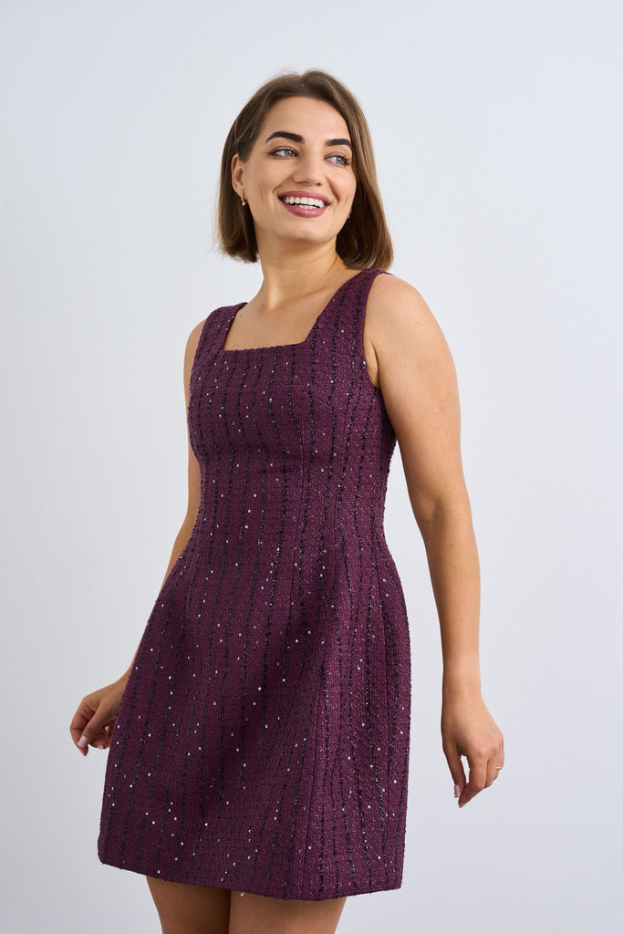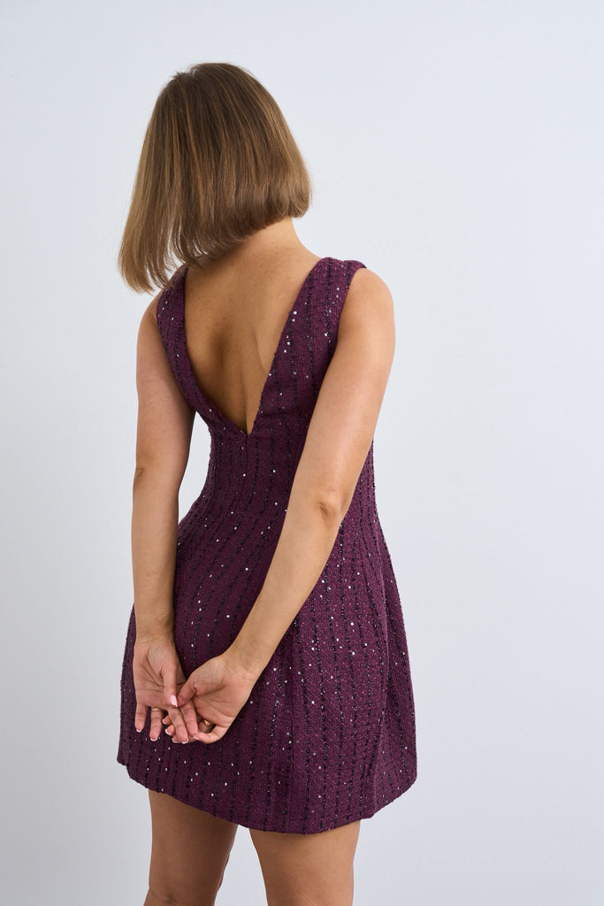 Unleash your inner fashionista in the Millie Glitz Mini Dress. This stunning mini dress features a tweed-like glitz fabric that catches the eye and a square neck that flatters any figure. The V back detail adds a touch of elegance. Perfect for a night out or special event. Lined.