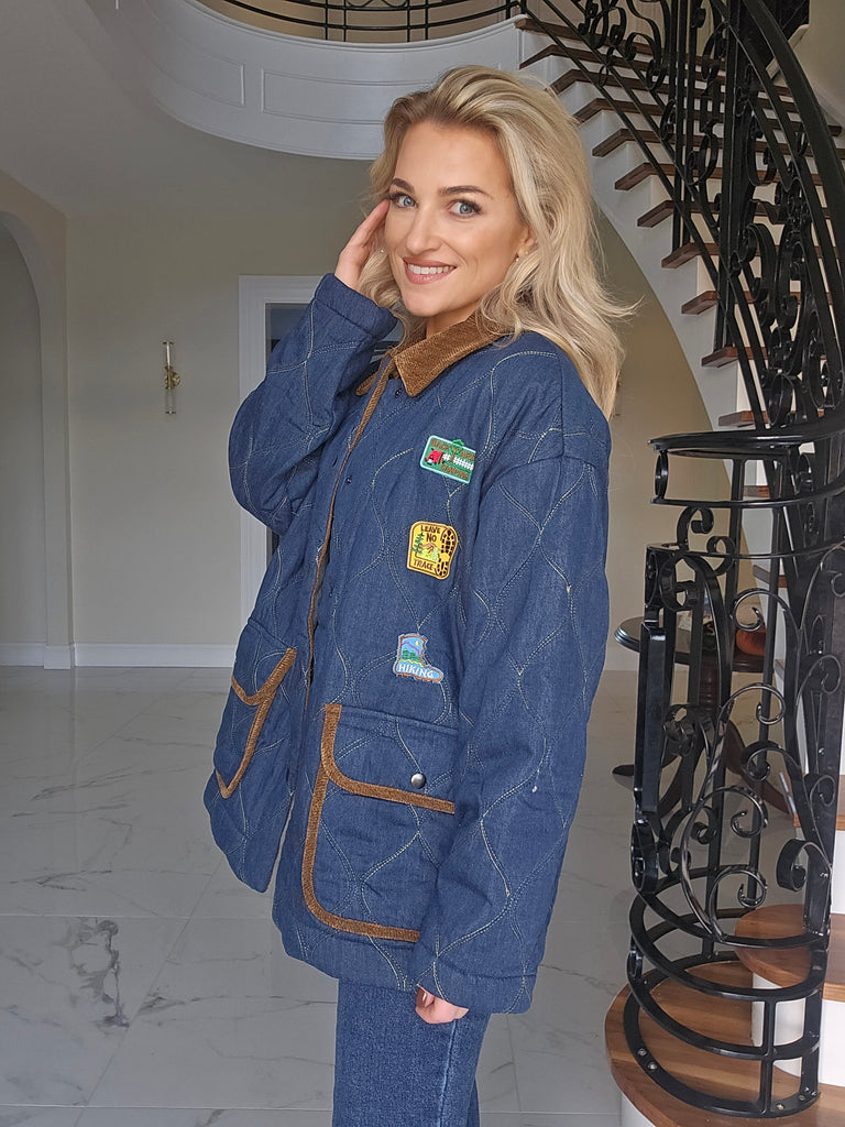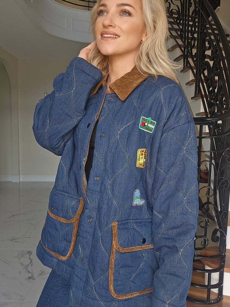 Step out in style with the Rena quilted jacket in fine denim. This versatile piece features a corduroy collar, large front pockets, and unique patches for a touch of personality. Made with 85% cotton and 15% polyester, it's both fashionable and practical. Perfect for any adventure, big or small!